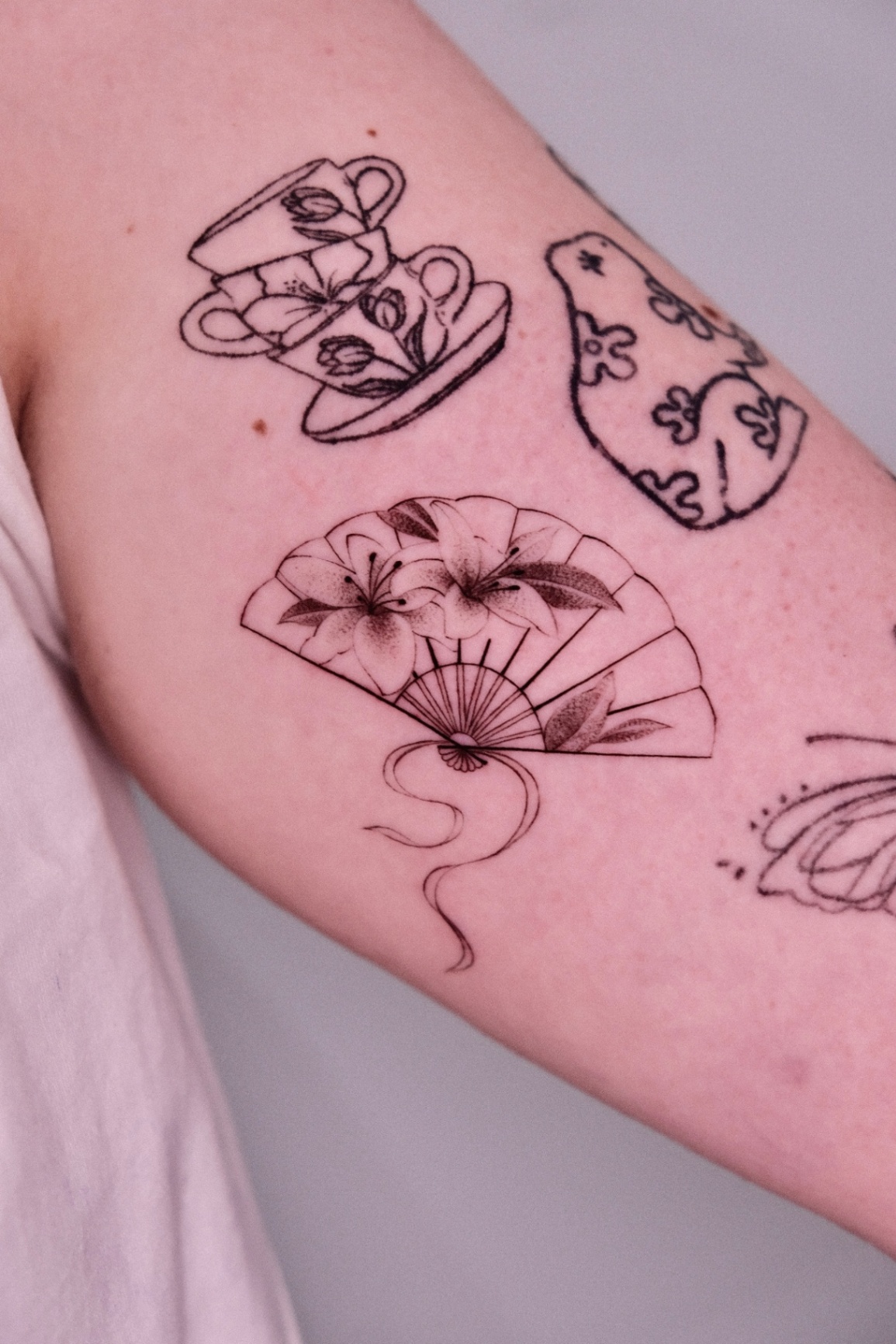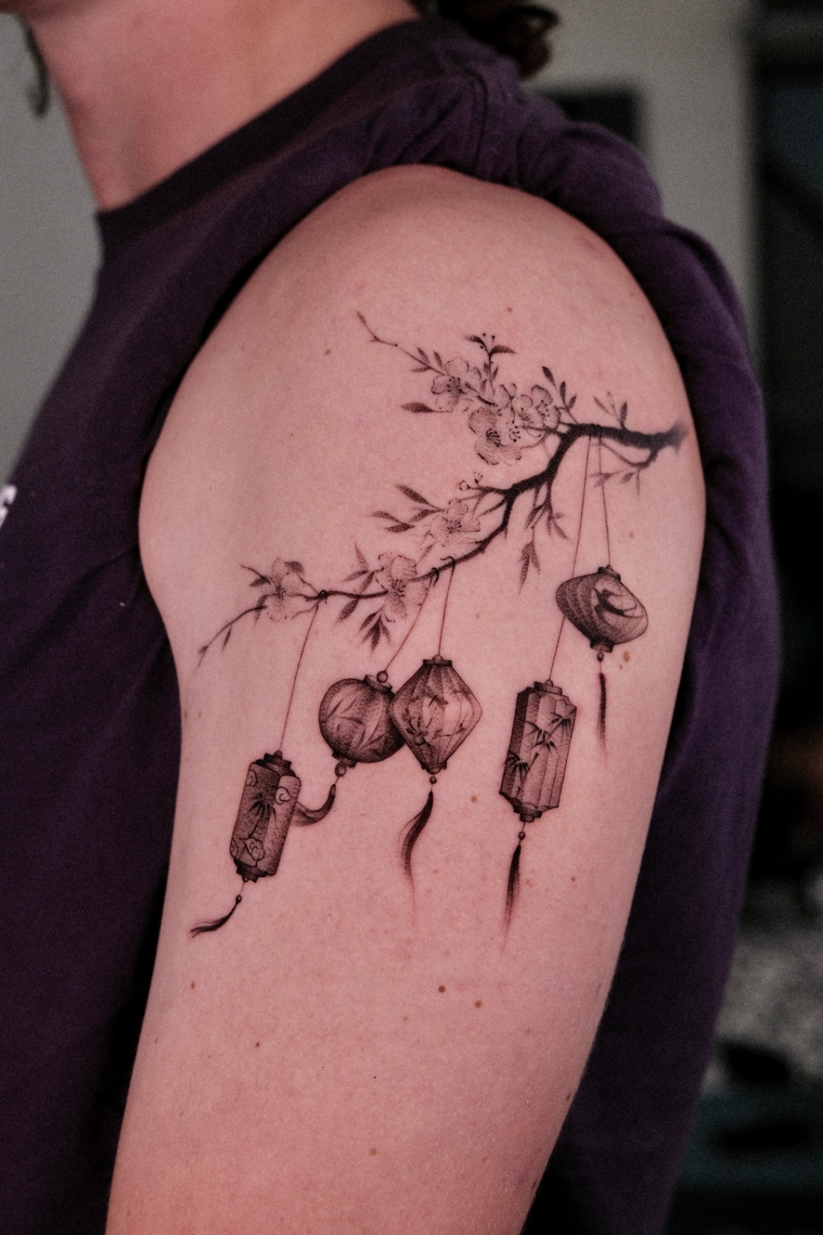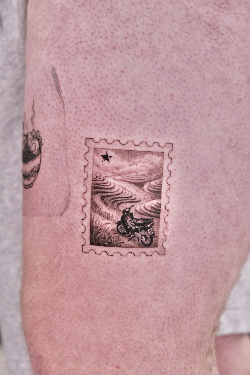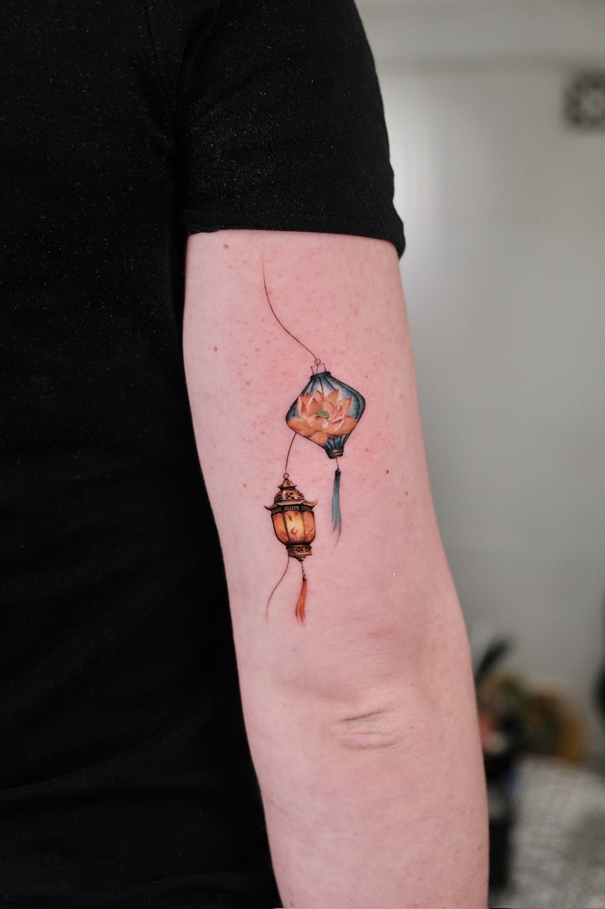 STAMP, LANTERN & HAND FAN tattoos focus on depth, shading, and contrast created with black ink and grey tones. This style emphasizes realism and smooth gradients, creating timeless designs with strong visual impact.